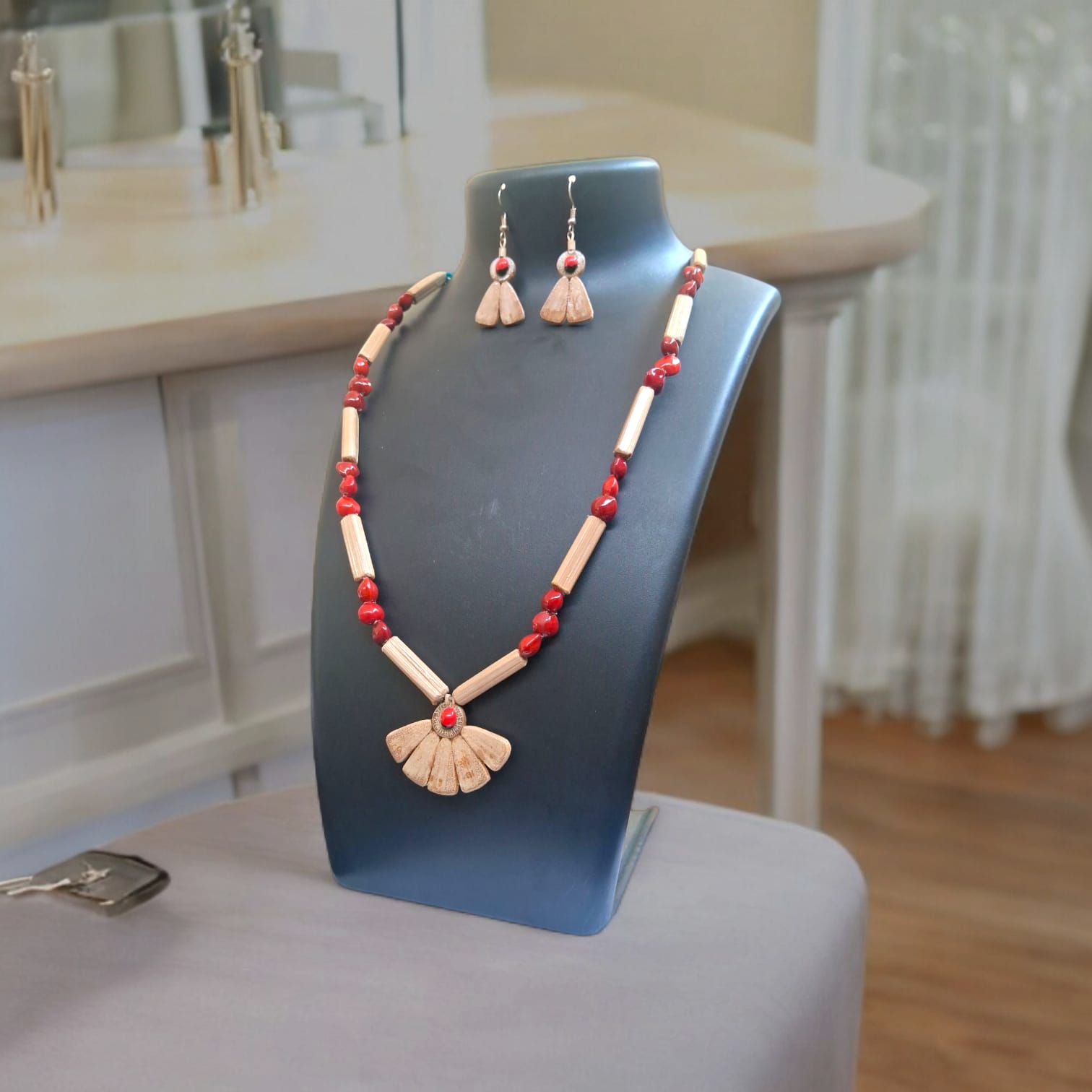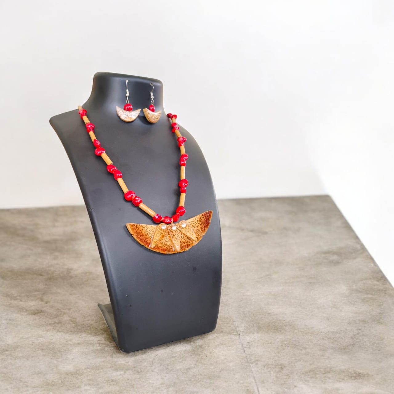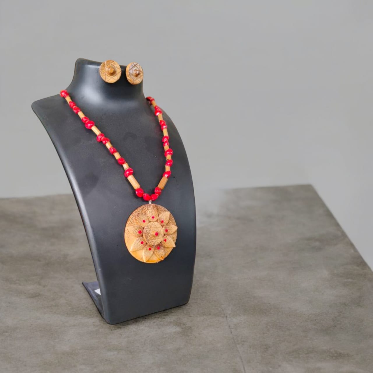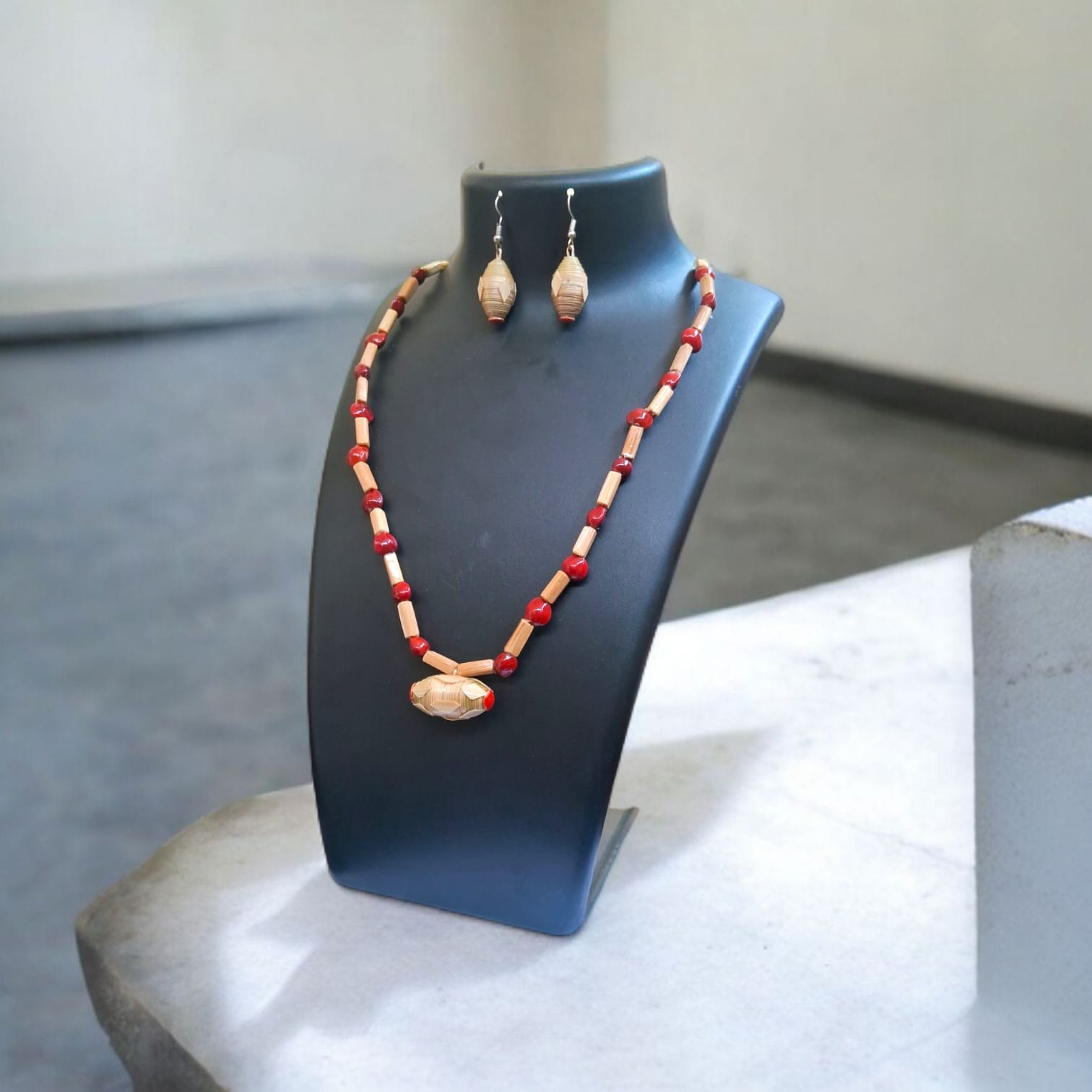 Assamese Red Bead & Bamboo Pendant Jewellery Set