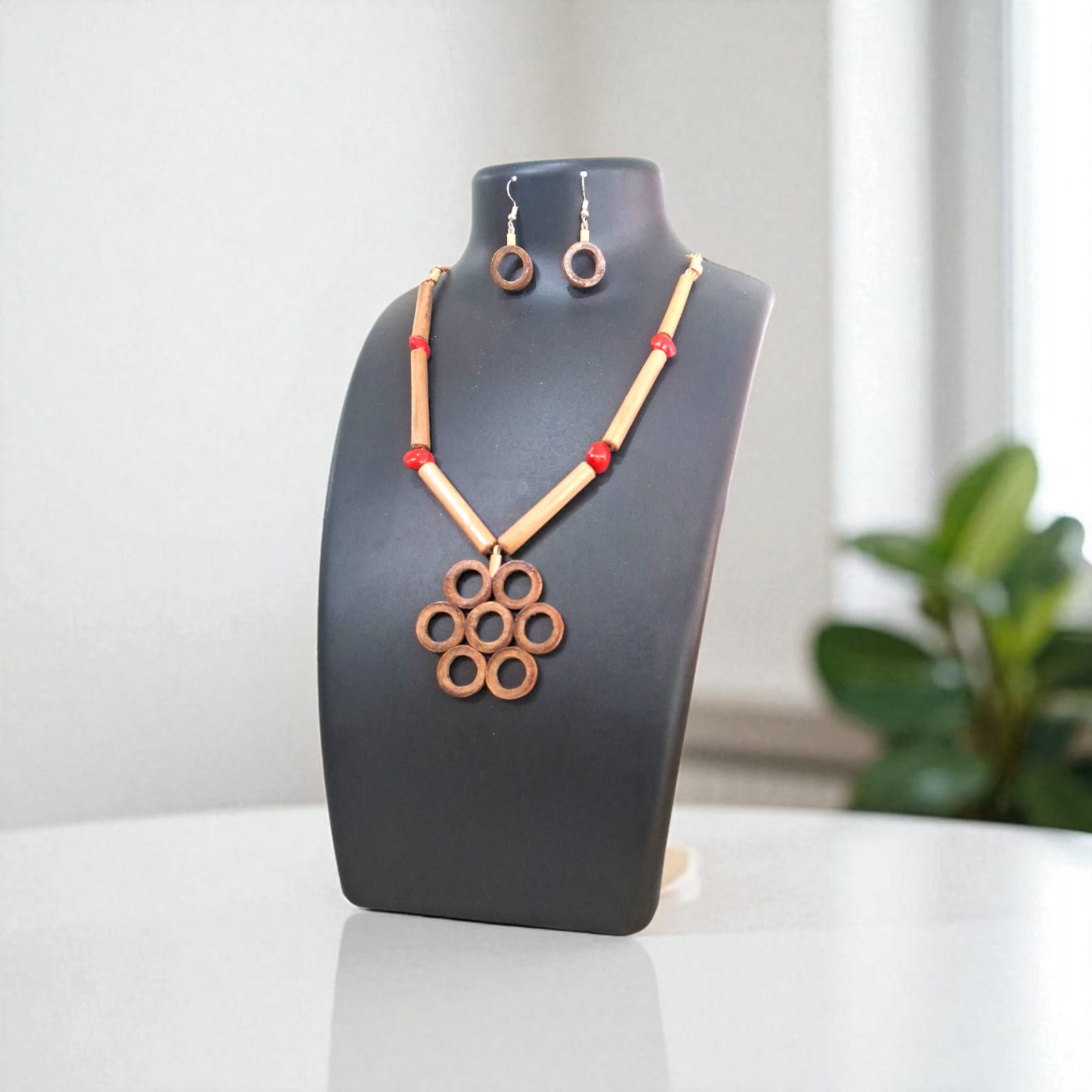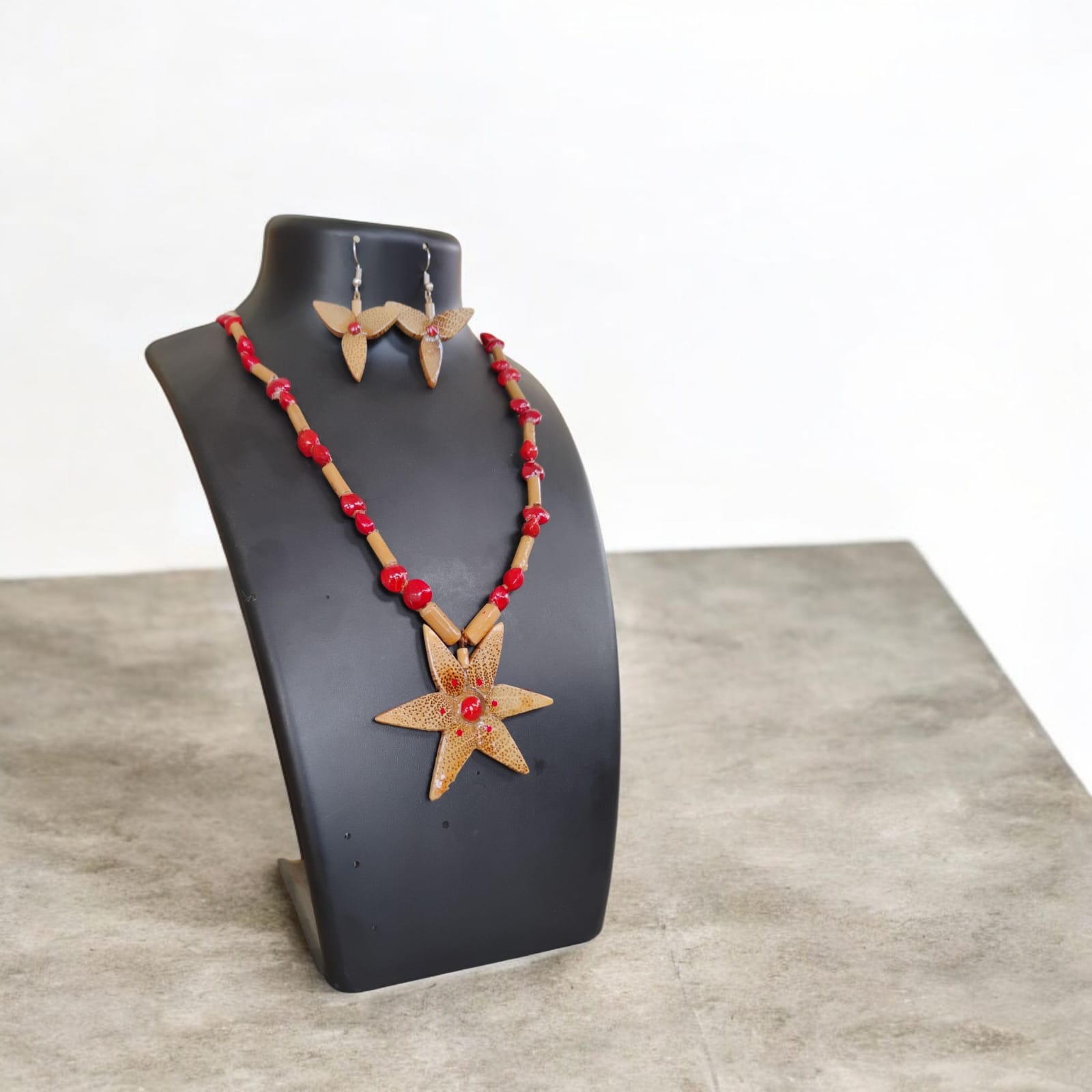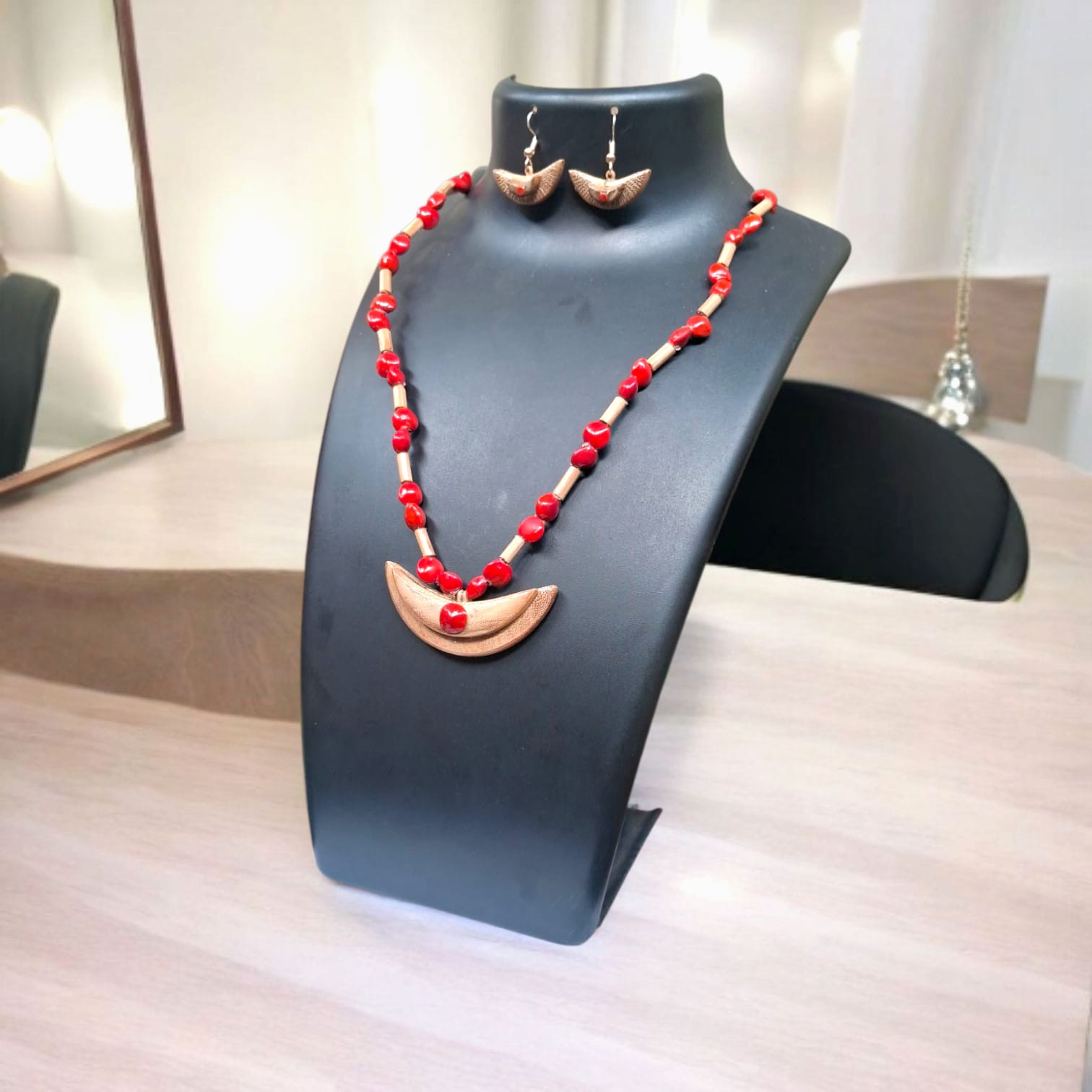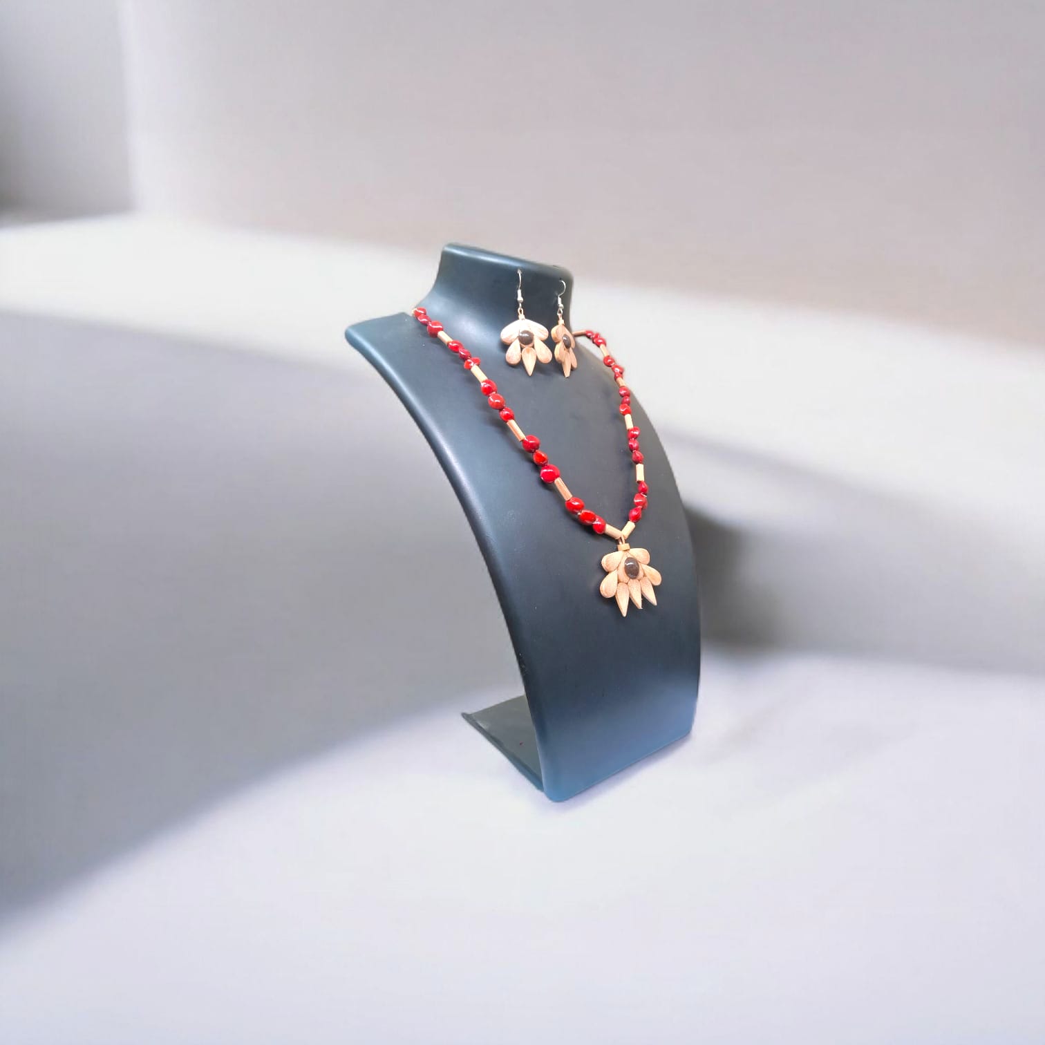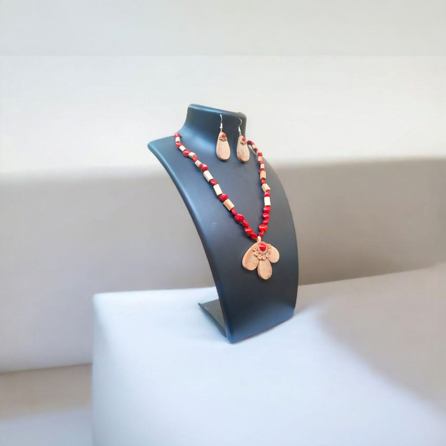 Assamese Red Bead & Bamboo Pendant Jewellery Set