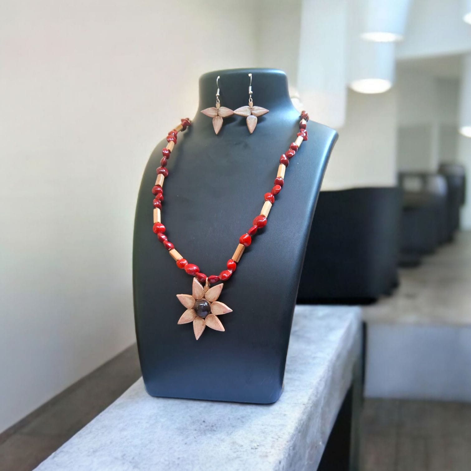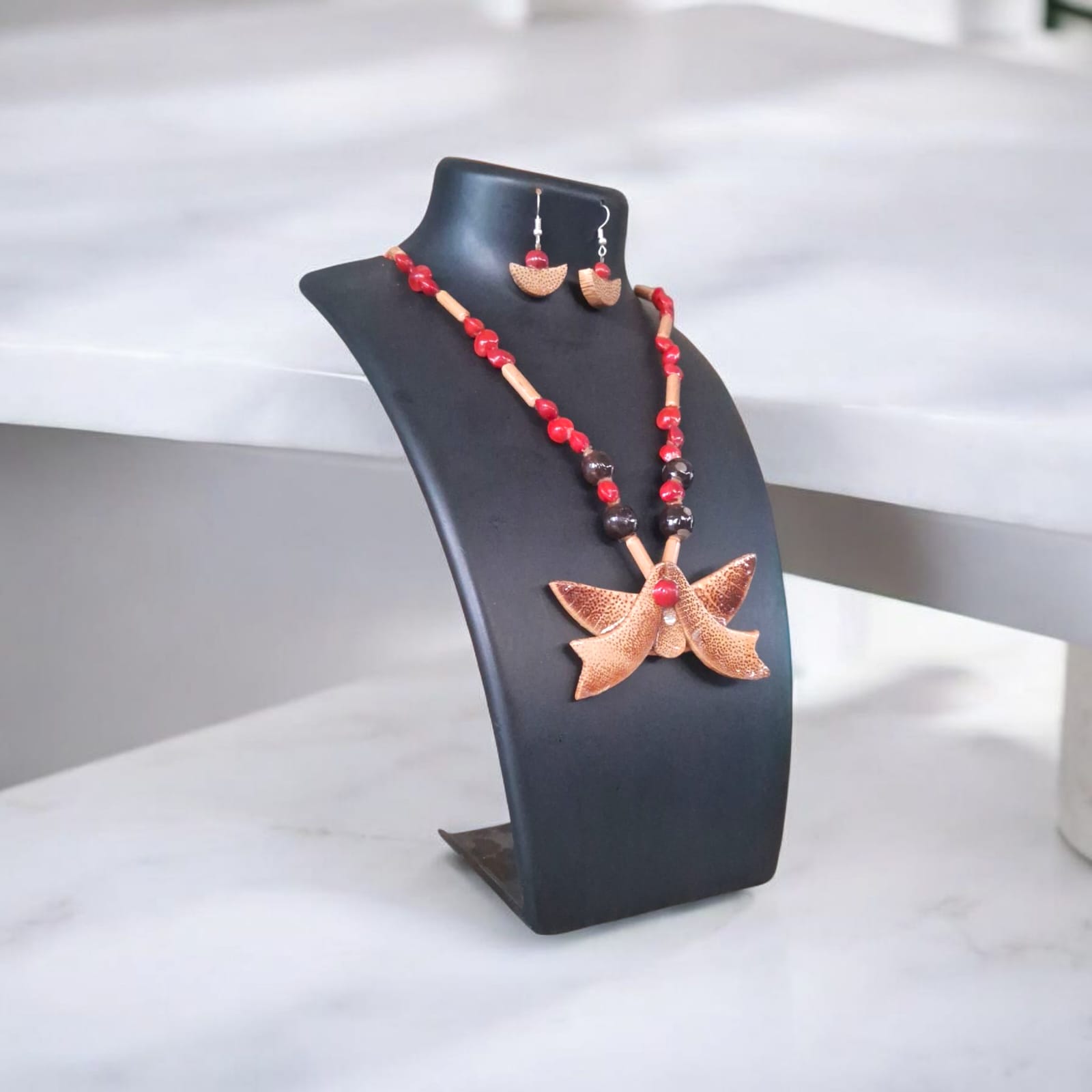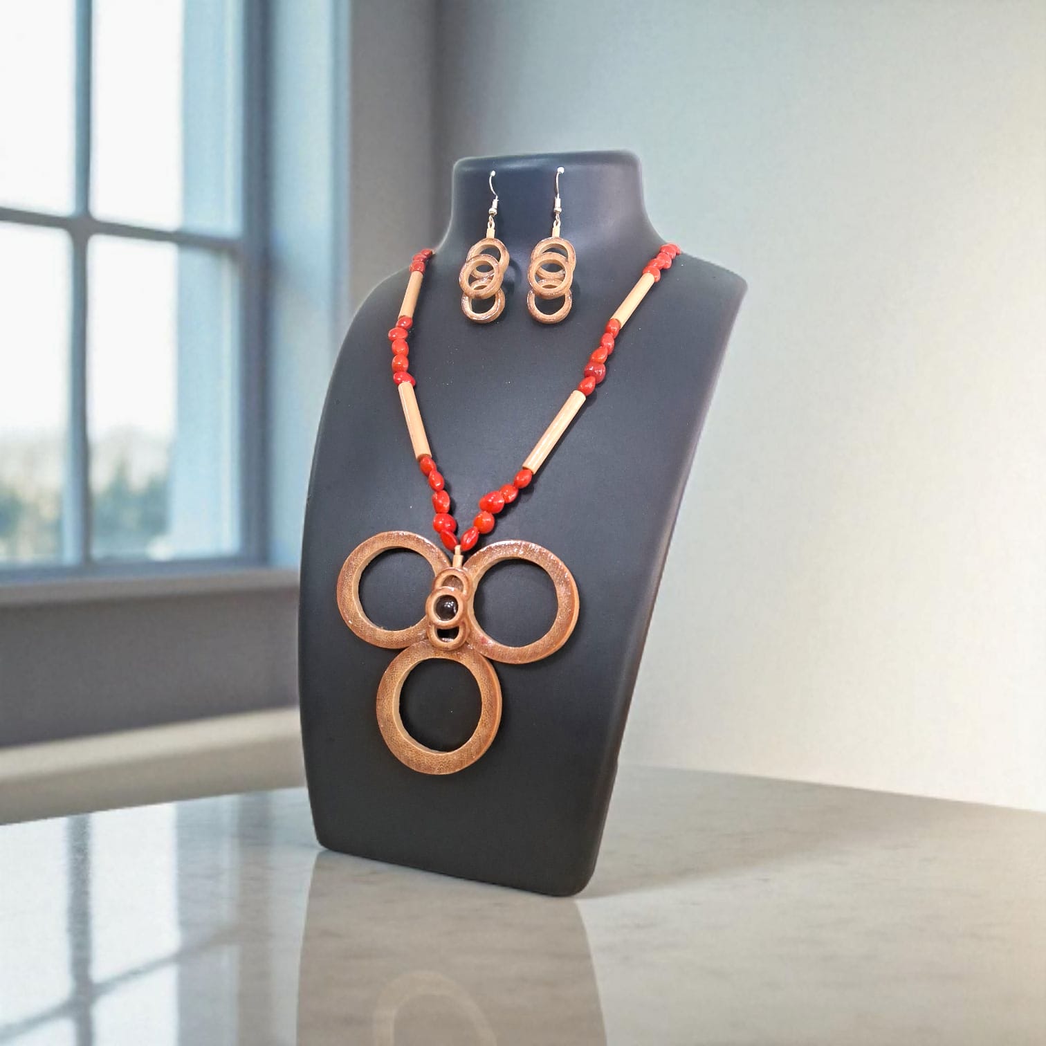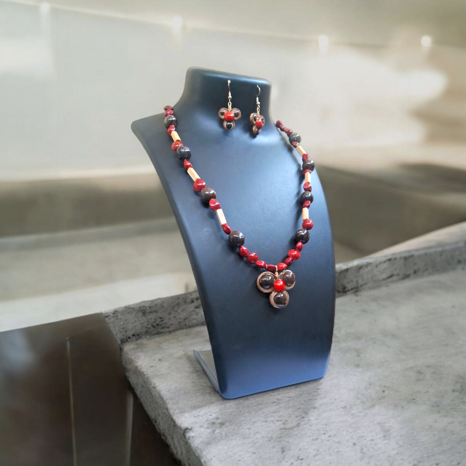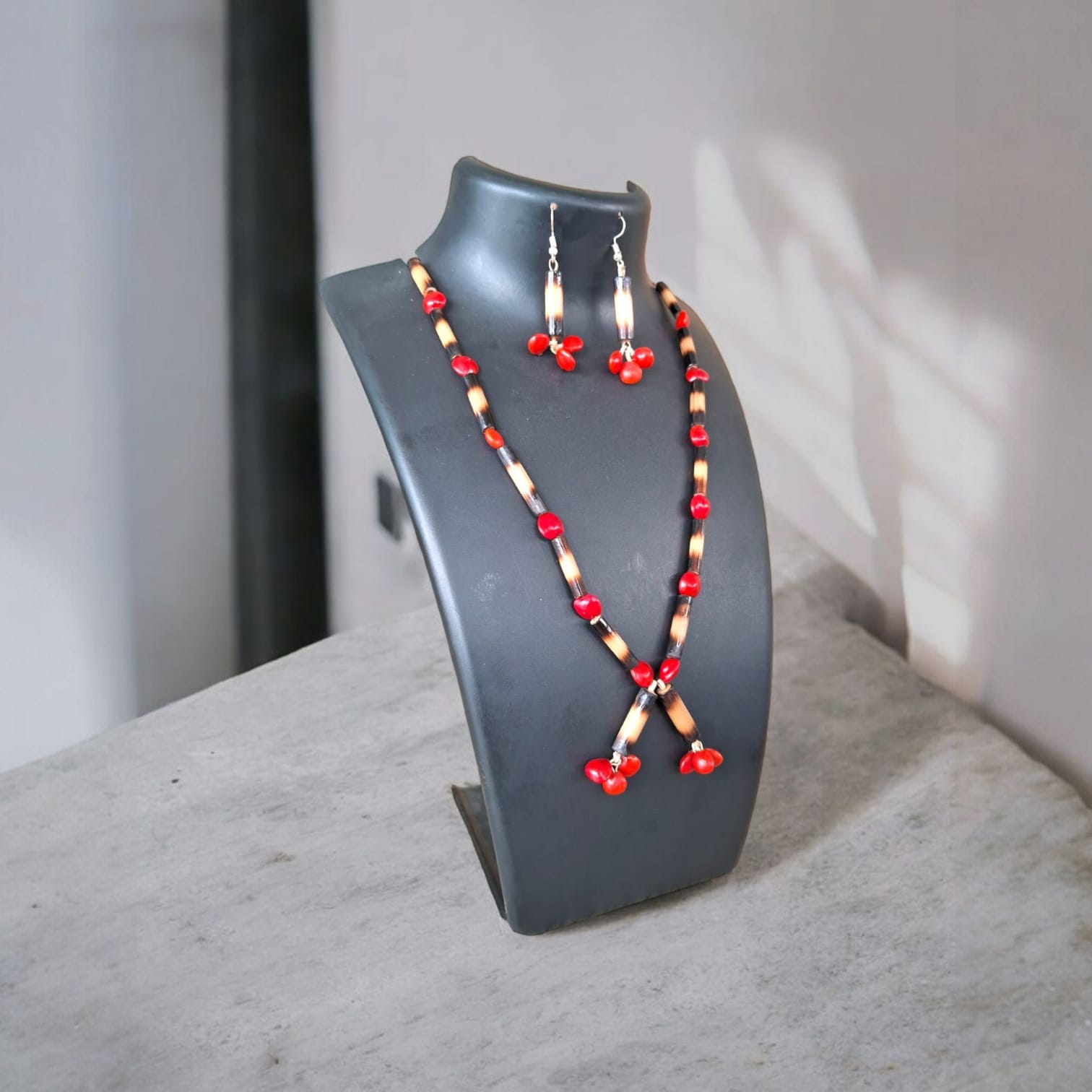 Assamese Crimson Bamboo Beads – Handcrafted Necklace & Earring Set