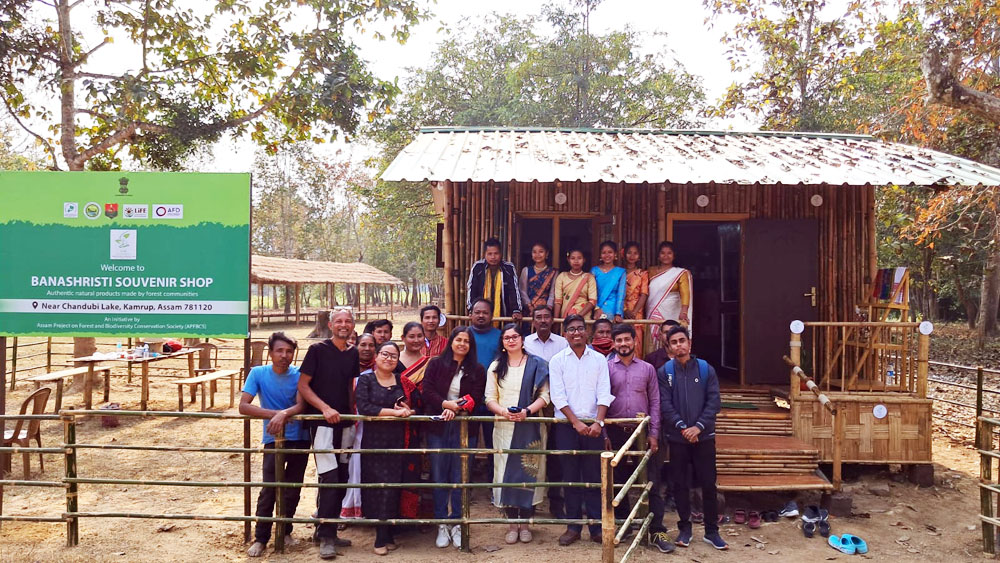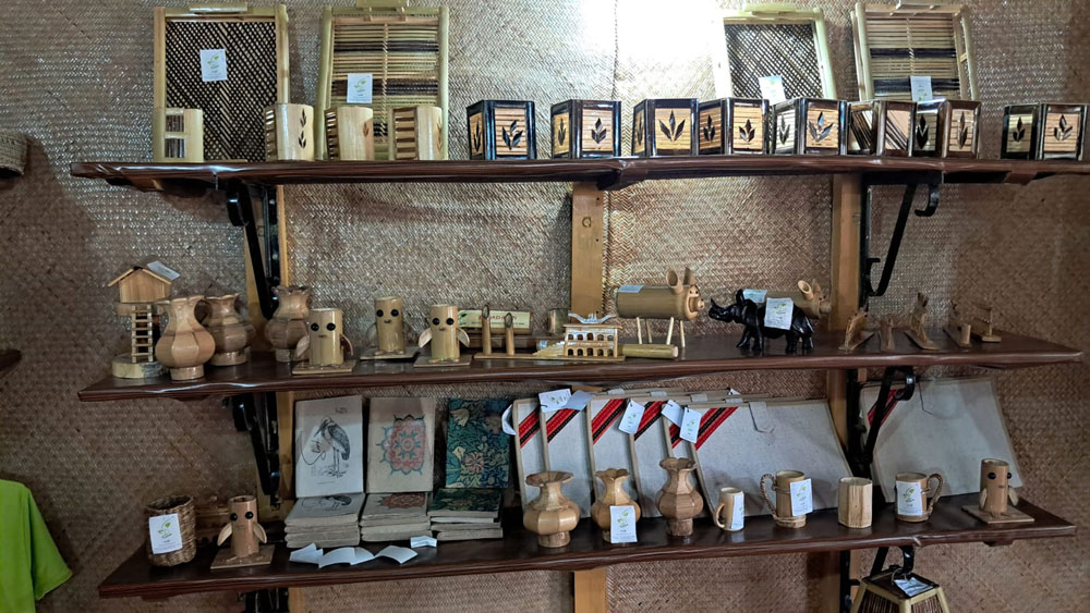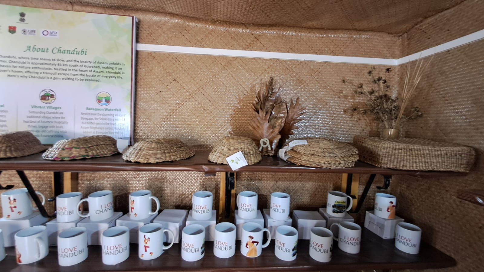 Banashristi Store at Chandubi Lake showcases the Products made by forest fringe community of Kamrup West Forest Division Products available at the store are handwoven textiles, bamboo jewelry, bamboo products, wildlife-themed T-shirts, mugs, diaries, keychains, water hyacinth bags, organic spices, pickles etc.